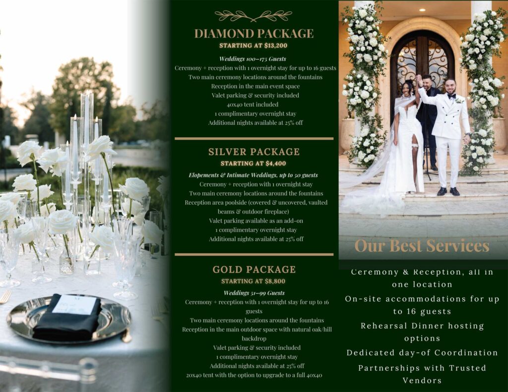- We provide a list of preferred vendors, which includes caterers, florists, photographers, DJs, live bands, lighting & sounds, event decor, wedding planners, & officiants.